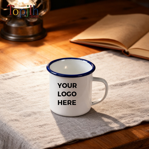 Topjlh Enamel Cups 12oz Sublimation Blanks Blue Black Steel Rims Custom LOGO Mugs Breakfast Brunch Parties Gift Promotional Gift